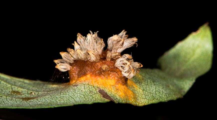 И, наконец, осенью ржавчина достигает пика своего развития: с нижней стороны листа образуются «рожки» – выросты, наполненные спорами. Они вскрываются и заражают… нет, не грушу…