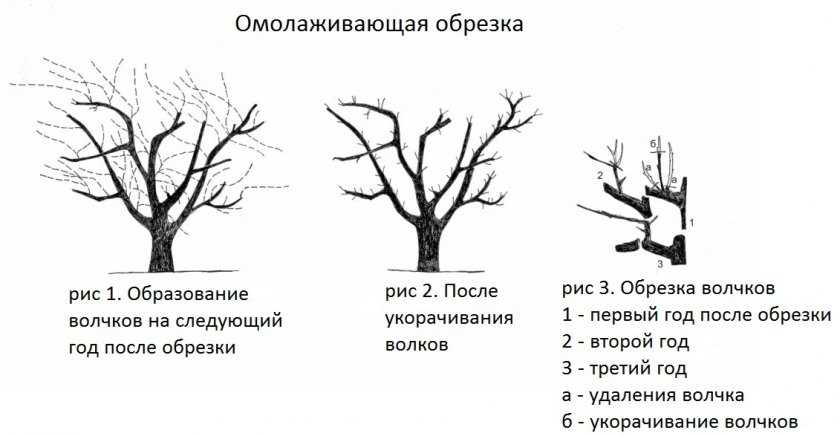 С помощью такой обрезки можно вызвать активный рост молодых веточек в тех случаях, когда прирост текущего года уменьшается. Одновременно со старыми побегами удаляется некоторая часть цветущих почек. Так можно разгрузить дерево и улучшить качество ягод.