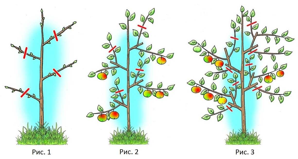 В первые месяцы после посадки проводить процедуру не рекомендуют. Деревцу требуется время для адаптации к новым условиям, особенно если месяцы выдались не самыми благоприятными. А вот через год сразу после схода снега, но пока не проснулись почки, и не началось сокодвижение в стволе самое время. Поэтому делайте это примерно в марте по следующей схеме: