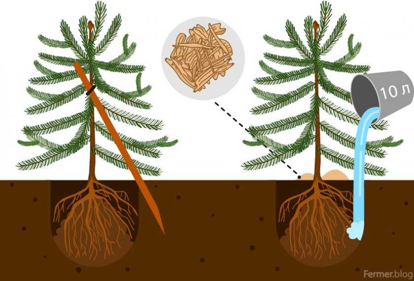 Землю не трогают две недели, так как за это время происходит полная усадка. По истечении этого времени на земле формируется небольшое возвышение, куда помещается саженец. Корни растения должны быть чистыми и не спутанными. Молодое растение помещают в почву, уплотняют, поливают. Стоит учитывать, что минимальное расстояние между двумя растениями должно составлять 2,5 метра.