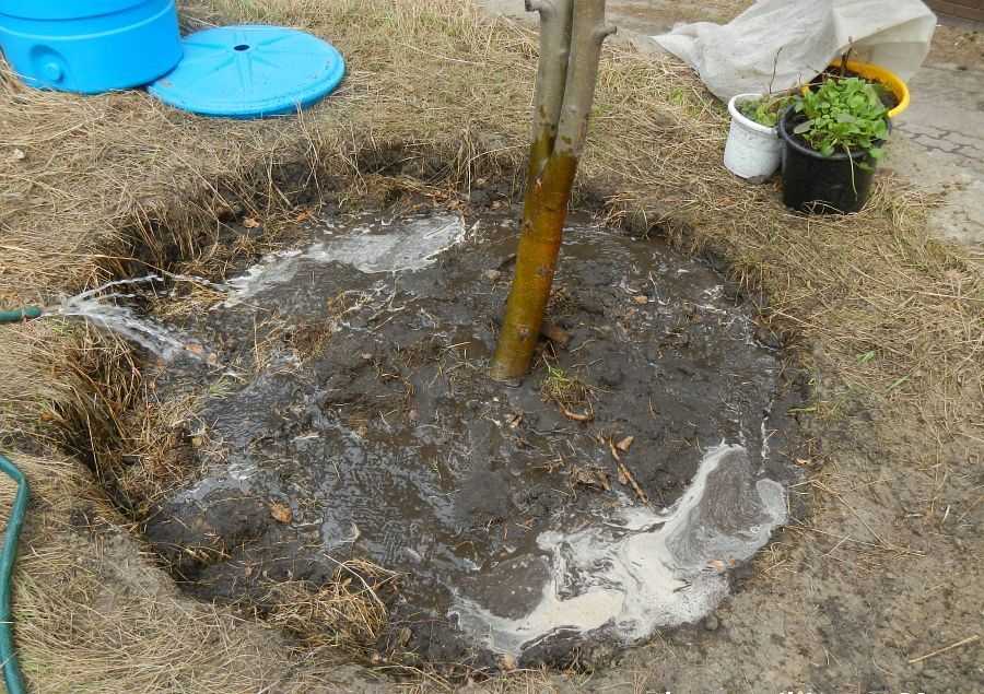 - Вокруг ствола дерева формируют валик из почвы для препятствования скоплению жидкости в корневой части.