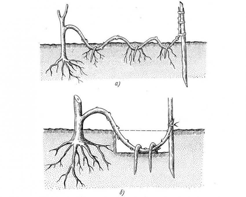 Отведение побегов: а — в ямки змейкой, б — в канавки