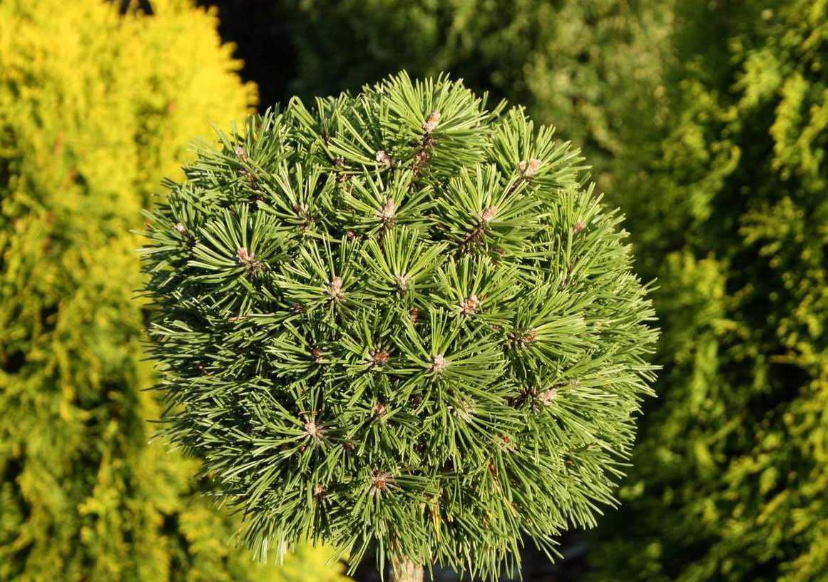 - – Mops- карликовый сорт горной сосны с зелеными, плотными иголками, сферическими, слегка сплюснутыми и медленным ростом, высота около 1,5 м;