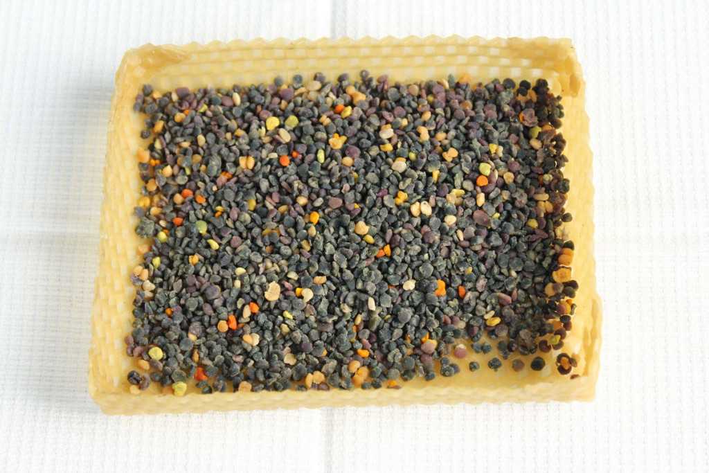 Свежесобранная пчелиная обножка содержит около 20-30 г воды на 100 г. (это сильно зависит от атмосферных условий). Высокая влажность — идеальная среда для жизнедеятельности бактерий и дрожжей. Именно почему пчеловоды собирают пыльцу из пыльцесборников каждый вечер и сразу помещают в морозильник. Через два дня все вредные насекомые погибают. Но после оттаивания пчелиную пыльцу можно хранить всего несколько часов.