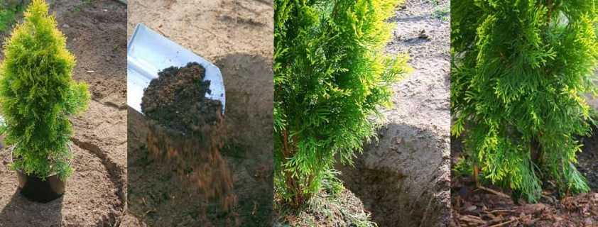 Оптимальное время для посадки туи — ранняя весна (после того, как немного прогреется земля). В это время начинается активная фаза роста побегов и корней. Посадку можно проводить и летом и осенью. При этом нужно понимать, что хвойные растения чувствительны к пересыханию корней, поэтому летнюю посадку нужно выполнять максимально быстро. При осенней посадке туя требует особой защиты в зимний период, так как корневая система не успевает хорошо прижиться. Необходимо будет закрепить деревце к опоре для предотвращения деформаций во время снегопадов и сильного ветра.