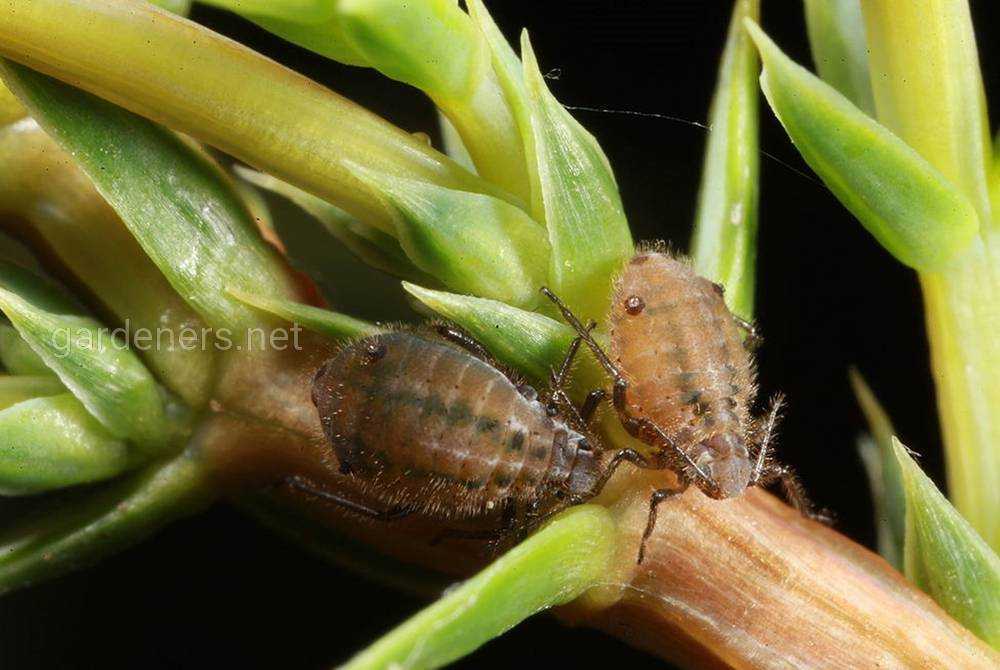 Опасным насекомым для западной туи считается и ложнощитовка. Взрослые паразиты имеют размер до 3 мм и окрашены в желто-коричневый оттенок. При этом огромный вред наносят туям не только взрослые паразиты, но и их личинки, зимующие под корой отростков. Они чаще всего заселяются там, где кустарники высажены в виде «живой изгороди». Чтобы избавиться навсегда от насекомых, нужно опрыскивать растения специальными препаратами («Актеллик», «Карбофос»). Обработку, как правило, осуществляют во время массового появления личинок (это наблюдается до распускания на лиственных деревьях почек).