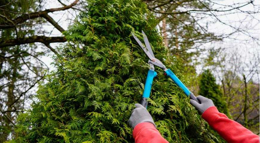 - стрижку туи для правильной формы кроны проводят также ранней весной, обрезают сначала сухие ветки, а затем формируют крону;