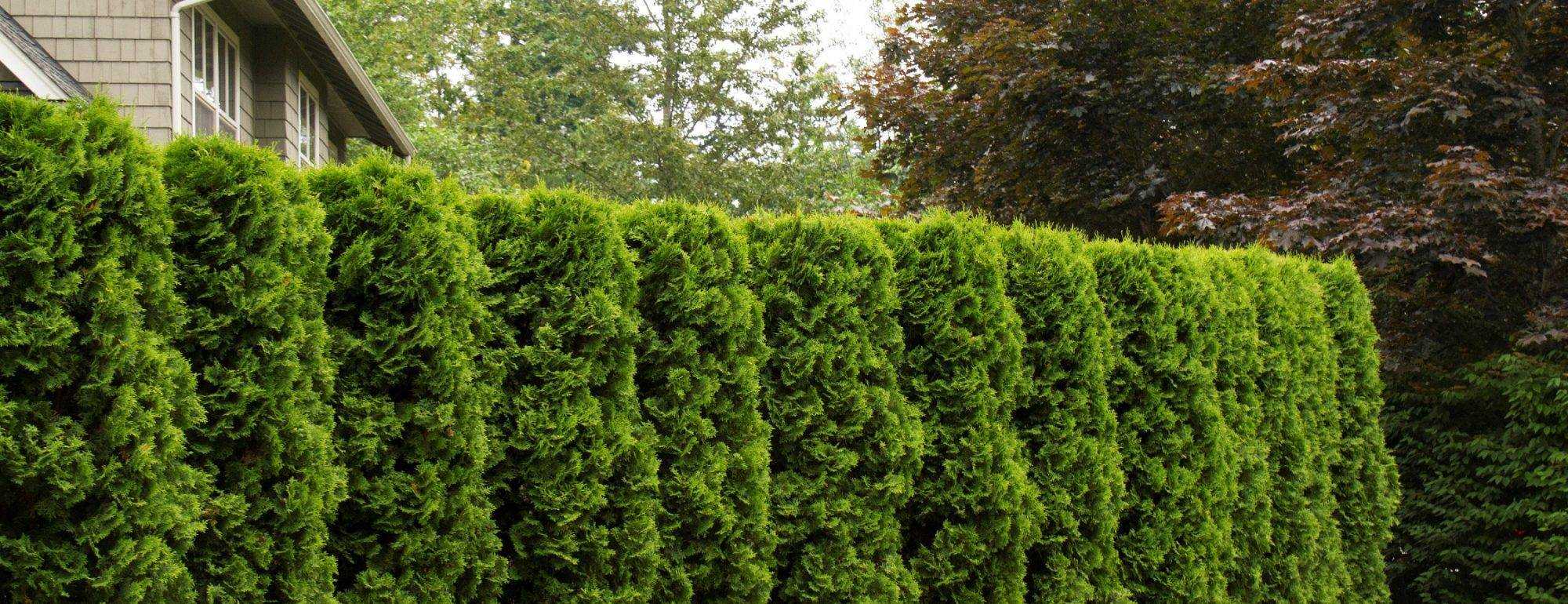 Живую изгородь из западной туи Холмструп, такую, как на фото вверху, формируют, обрезая побеги на треть. В дальнейшем для поддержания формы ее ровняют от 3 до 5 раз в год.